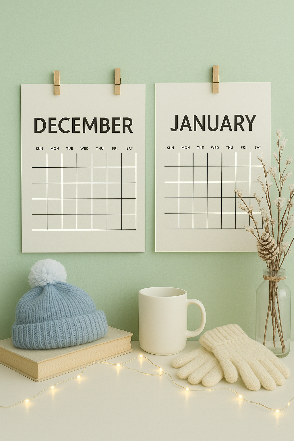 Calendar pages for December and January hanging on a green wall, with a blue knit hat, a beige book, a white mug, cream-colored gloves, a glass jar of dried flowers, and string lights on a white surface.