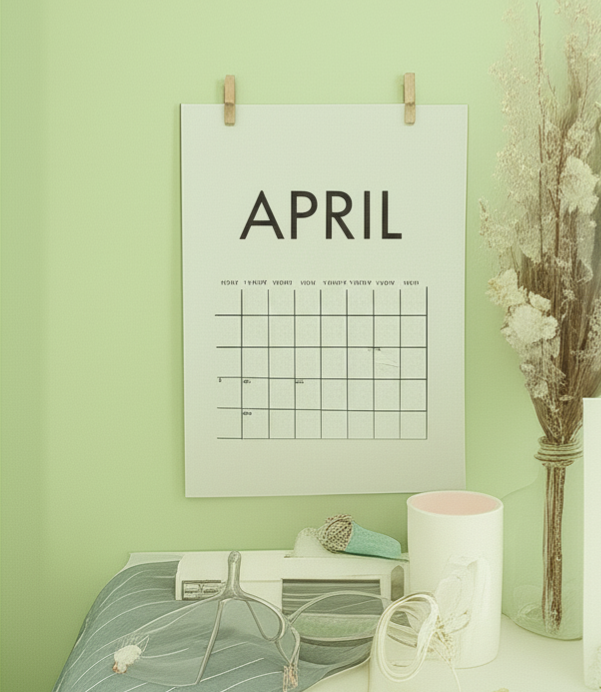A calendar page for April hanging on a mint green wall, with a vase of dried flowers and various desk items below.